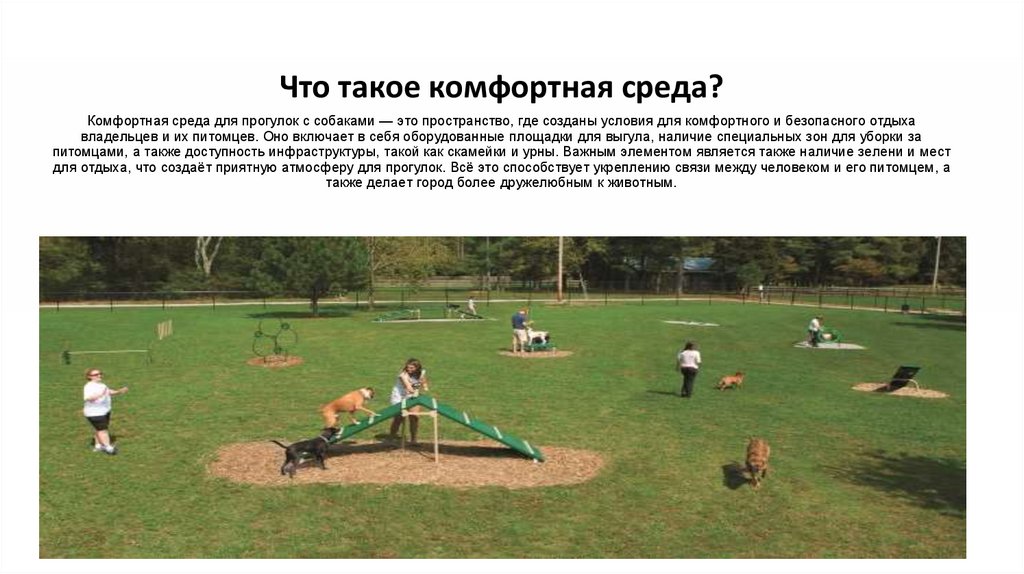 Что такое комфортная среда?Комфортная среда для прогулок с собаками — это пространство, где созданы условия для комфортного и безопасного отдыха