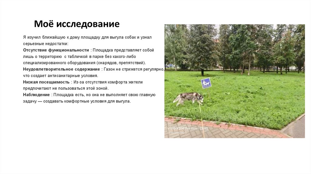 Моё исследованиеЯ изучил ближайшую к дому площадку для выгула собак и узнал