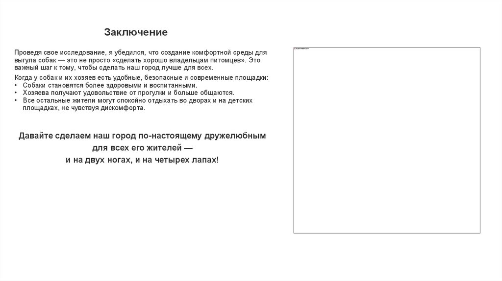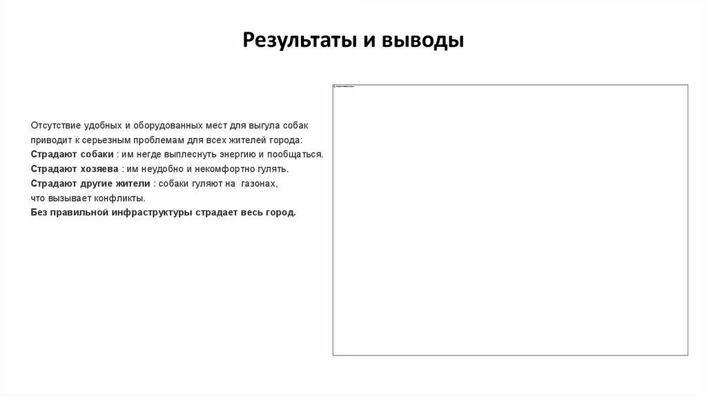 Результаты и выводыОтсутствие удобных и оборудованных мест для выгула собак
