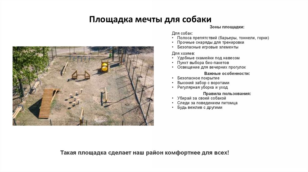 владельцев и их питомцев. Оно включает в себя оборудованные площадки для выгула, наличие специальных зон для уборки за