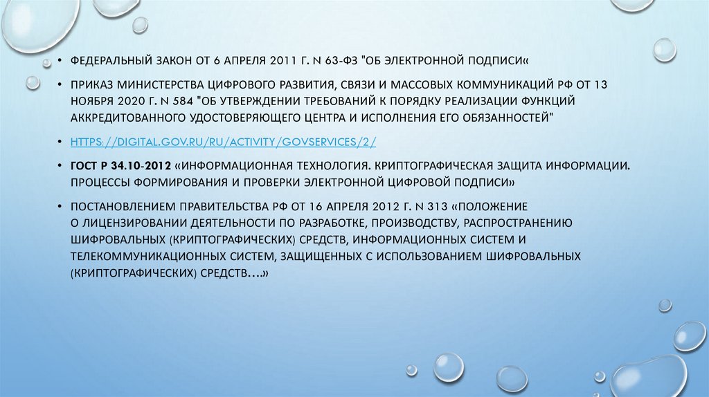 • ФЕДЕРАЛЬНЫЙ ЗАКОН ОТ 6 АПРЕЛЯ 2011 Г. N 63-ФЗ "ОБ ЭЛЕКТРОННОЙ ПОДПИСИ«• ПРИКАЗ МИНИСТЕРСТВА ЦИФРОВОГО РАЗВИТИЯ, СВЯЗИ И МАССОВЫХ КОММУНИКАЦИЙ РФ ОТ 13