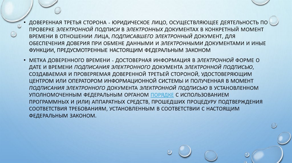• ДОВЕРЕННАЯ ТРЕТЬЯ СТОРОНА - ЮРИДИЧЕСКОЕ ЛИЦО, ОСУЩЕСТВЛЯЮЩЕЕ ДЕЯТЕЛЬНОСТЬ ПОПРОВЕРКЕ ЭЛЕКТРОННОЙ ПОДПИСИ В ЭЛЕКТРОННЫХ ДОКУМЕНТАХ В КОНКРЕТНЫЙ МОМЕНТ