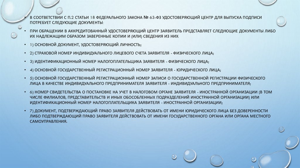 • В СООТВЕТСТВИИ С П.2 СТАТЬИ 18 ФЕДЕРАЛЬНОГО ЗАКОНА № 63-ФЗ УДОСТОВЕРЯЮЩИЙ ЦЕНТР ДЛЯ ВЫПУСКА ПОДПИСИПОТРЕБУЕТ СЛЕДУЮЩИЕ ДОКУМЕНТЫ:
