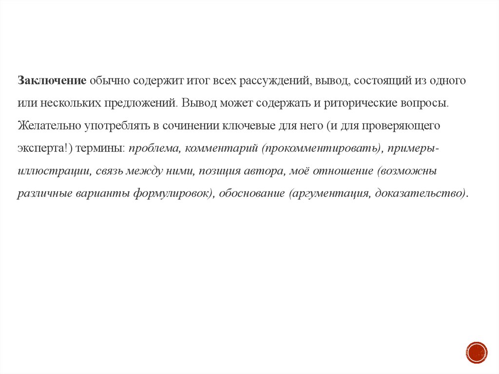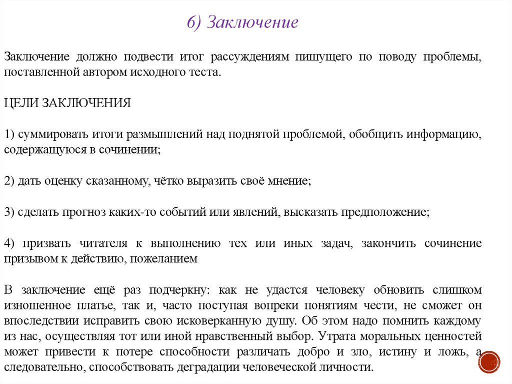 6) ЗаключениеЗаключение должно подвести итог рассуждениям пишущего по поводу проблемы,
