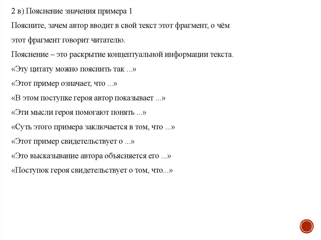 2 в) Пояснение значения примера 1Поясните, зачем автор вводит в свой текст этот фрагмент, о чём