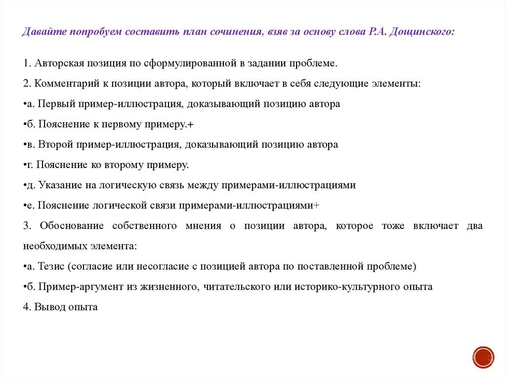 Давайте попробуем составить план сочинения, взяв за основу слова Р.А. Дощинского:1. Авторская позиция по сформулированной в задании проблеме.