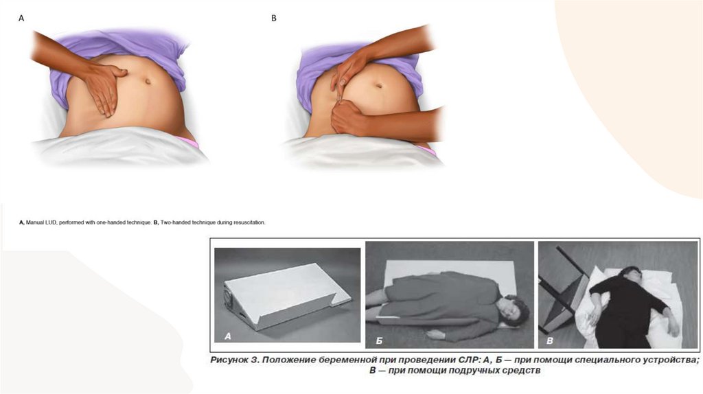 • Первым и обязательным действием при проведении СЛР убеременных с сроком более 20 недель является устранение