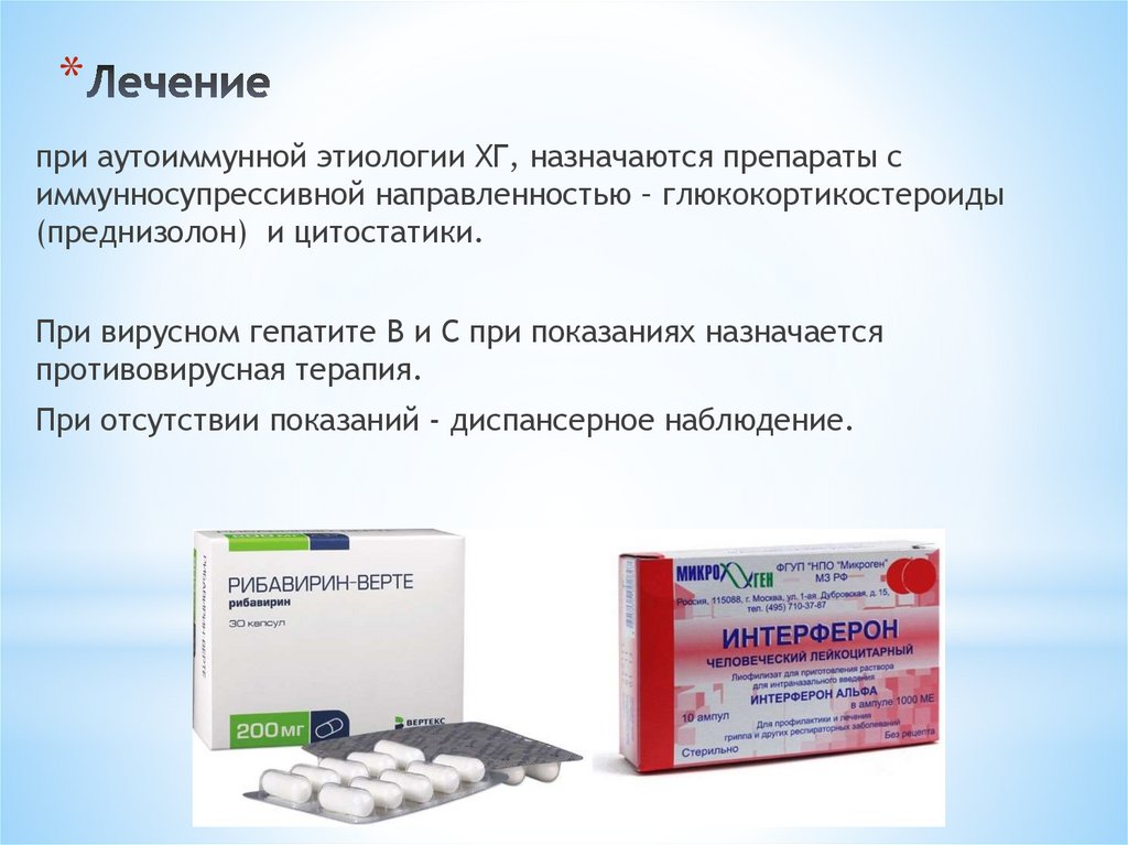 *при аутоиммунной этиологии ХГ, назначаются препараты с