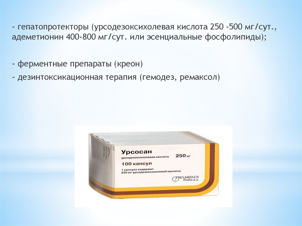 - гепатопротекторы (урсодезоксихолевая кислота 250 -500 мг/сут.,адеметионин 400-800 мг/сут. или эсенциальные фосфолипиды);