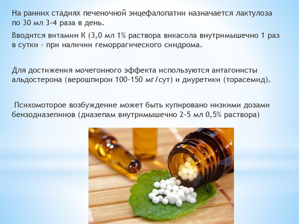 На ранних стадиях печеночной энцефалопатии назначается лактулозапо 30 мл 3–4 раза в день.