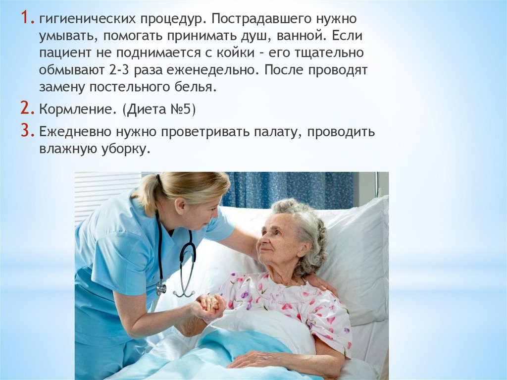 1. гигиенических процедур. Пострадавшего нужноумывать, помогать принимать душ, ванной. Если