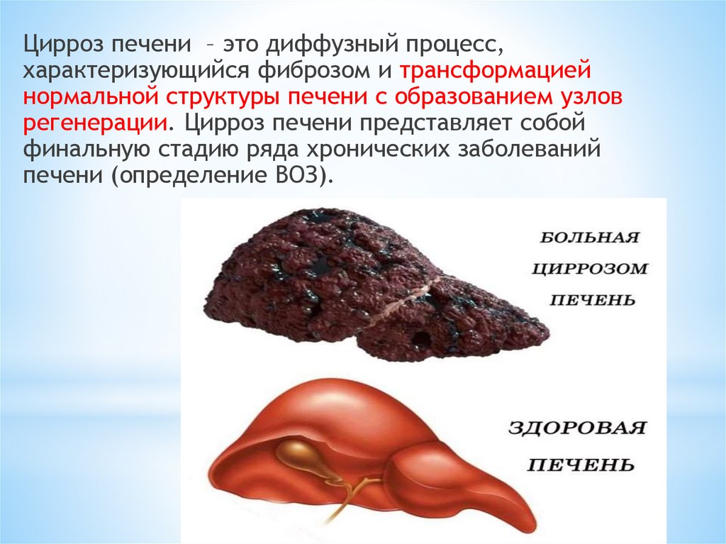 Цирроз печени – это диффузный процесс,характеризующийся фиброзом и трансформацией