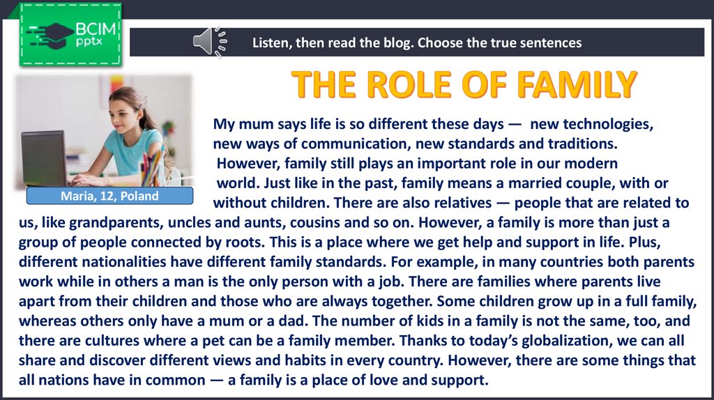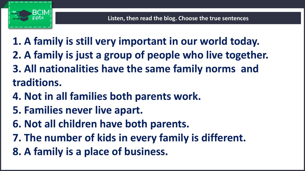 Listen, then read the blog. Choose the true sentences1. A family is still very important in our world today.