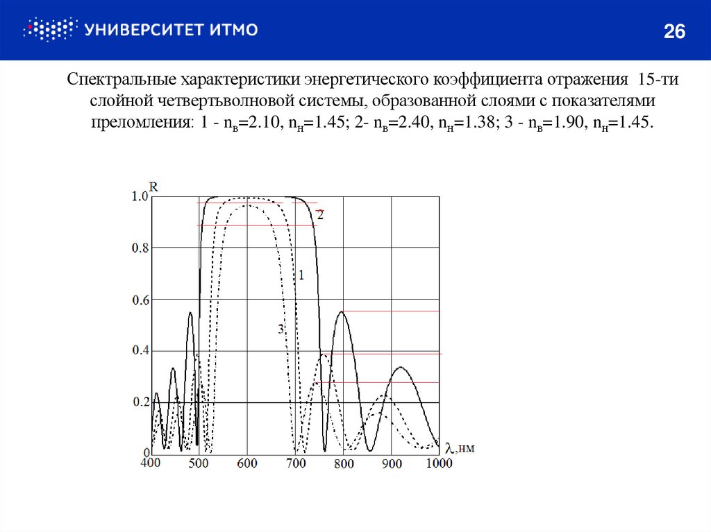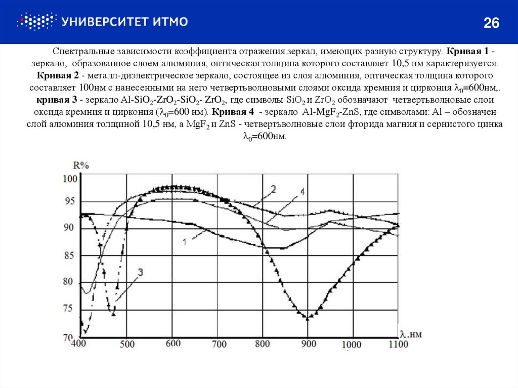 26Спектральные зависимости коэффициента отражения зеркал, имеющих разную структуру. Кривая 1 зеркало, образованное слоем алюминия, оптическая толщина которого составляет 10,5 нм характеризуется.