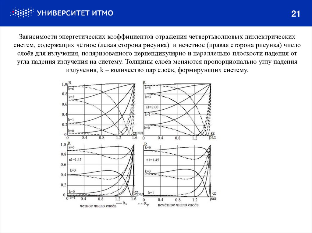 21Зависимости энергетических коэффициентов отражения четвертьволновых диэлектрических