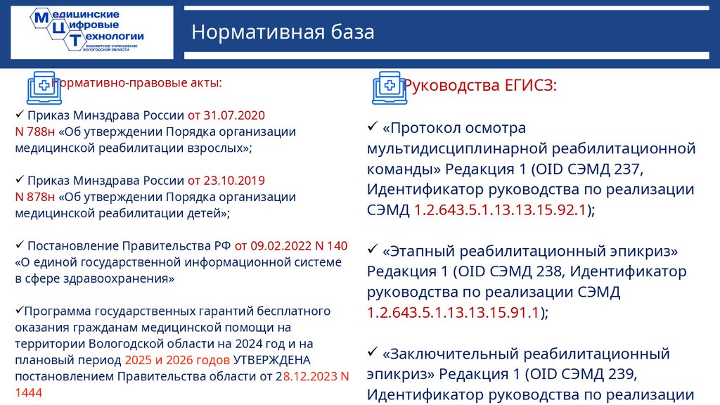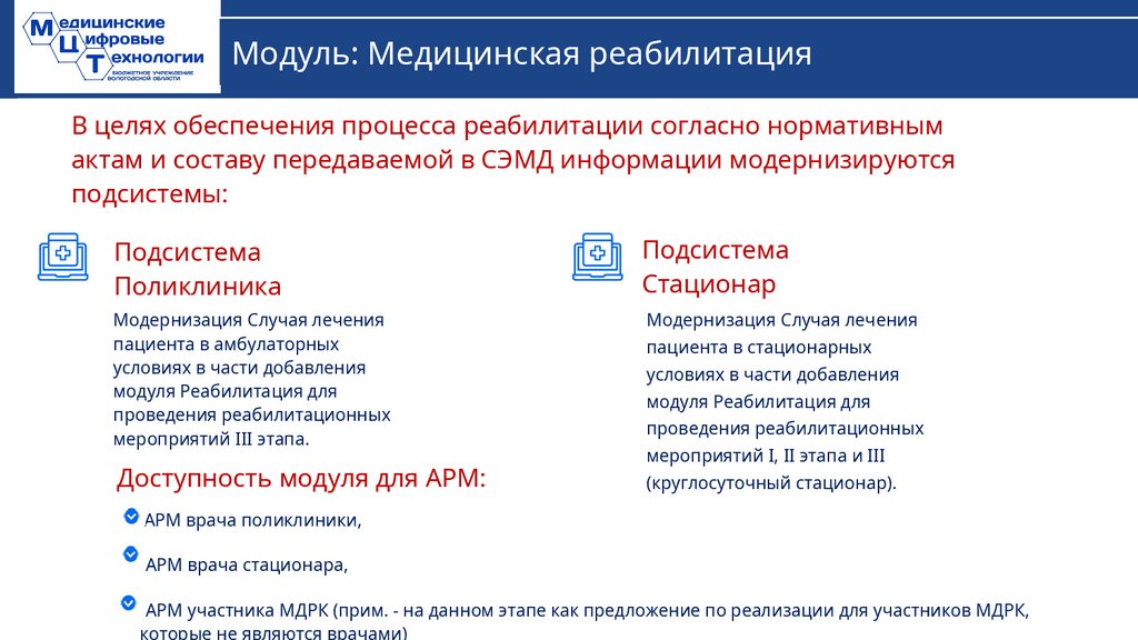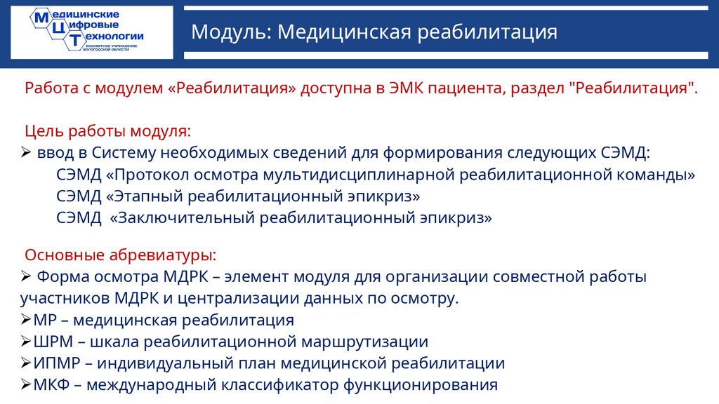 Модуль: Медицинская реабилитацияВ целях обеспечения процесса реабилитации согласно нормативным