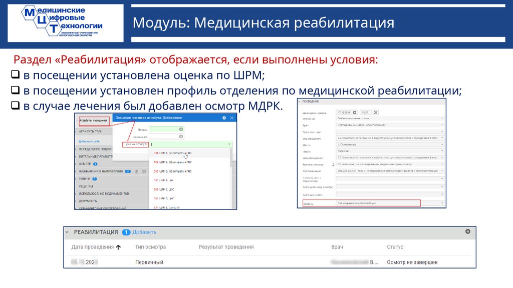 Модуль: Медицинская реабилитацияРаздел «Реабилитация» отображается, если выполнены условия:
