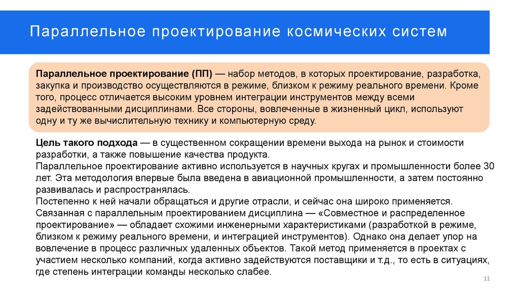 Параллельное проектирование космических системПараллельное проектирование (ПП) — набор методов, в которых проектирование, разработка,