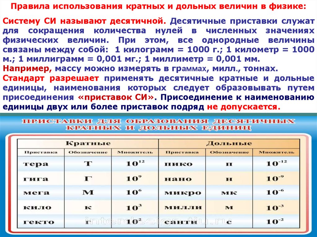 Правила использования кратных и дольных величин в физике:Систему СИ называют десятичной. Десятичные приставки служат