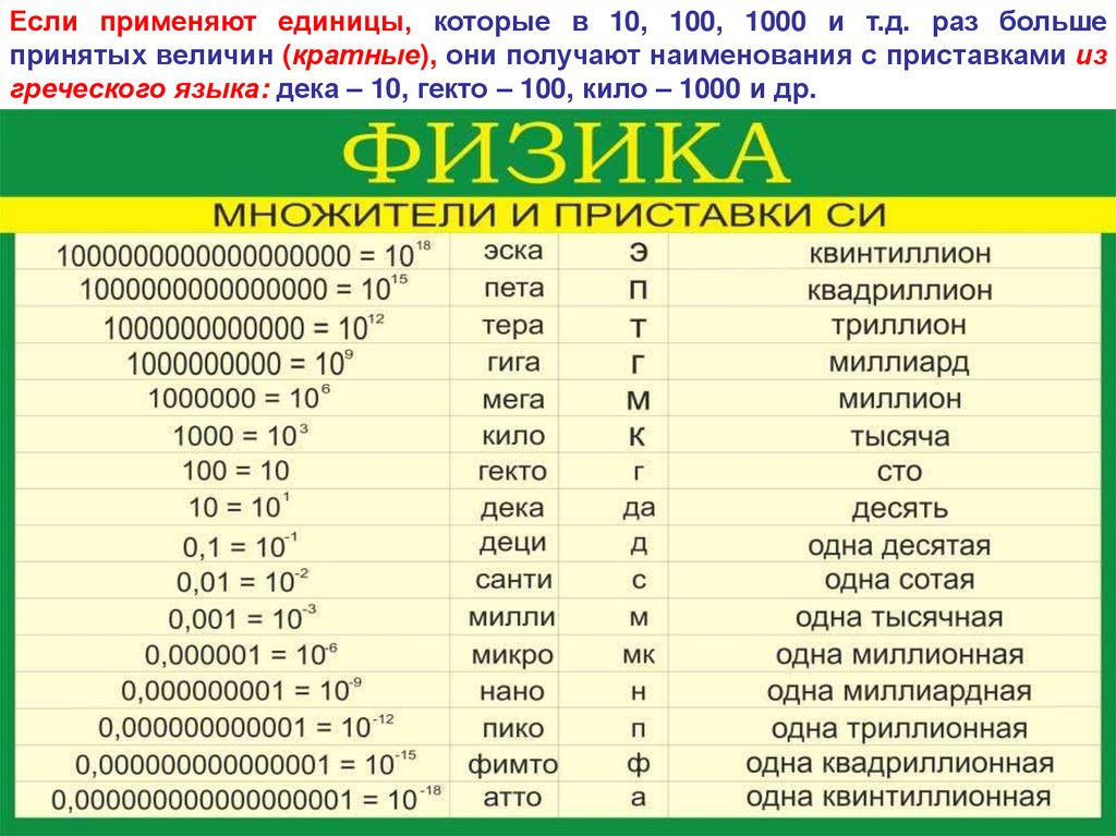 Если применяют единицы, которые в 10, 100, 1000 и т.д. раз большепринятых величин (кратные), они получают наименования с приставками из