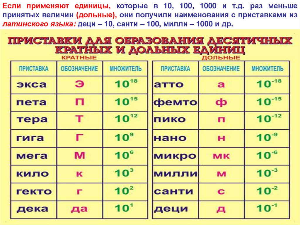 Если применяют единицы, которые в 10, 100, 1000 и т.д. раз меньшепринятых величин (дольные), они получили наименования с приставками из
