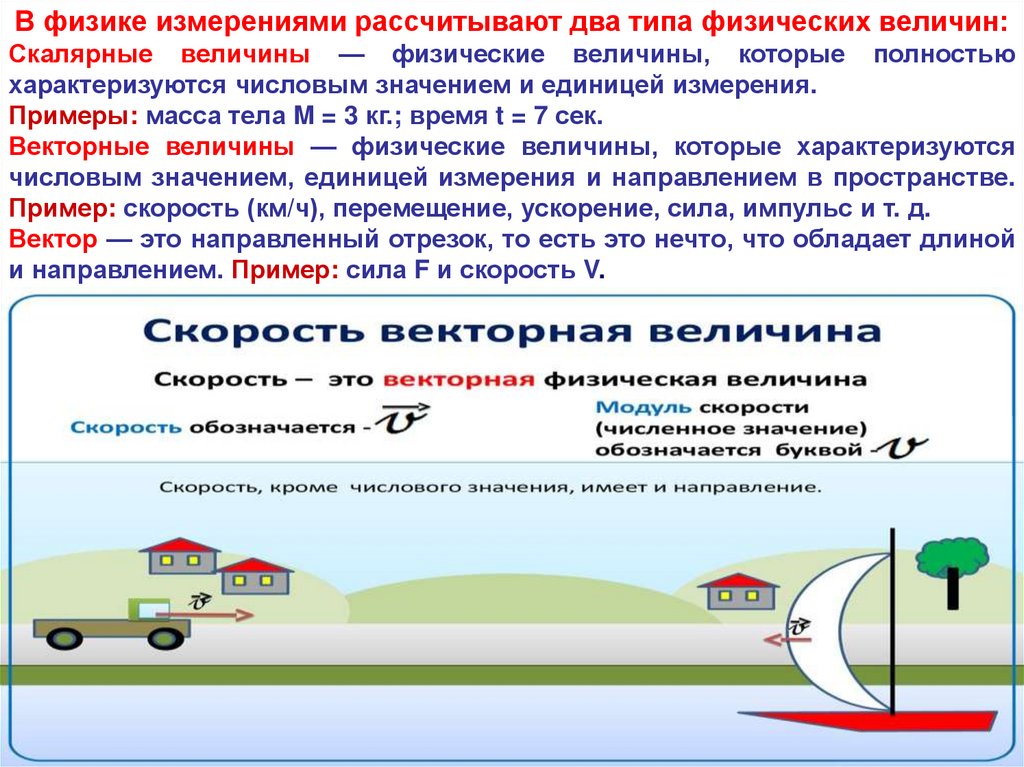 В физике измерениями рассчитывают два типа физических величин:Скалярные величины — физические величины, которые полностью