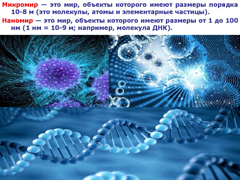 Микромир — это мир, объекты которого имеют размеры порядка10-8 м (это молекулы, атомы и элементарные частицы).