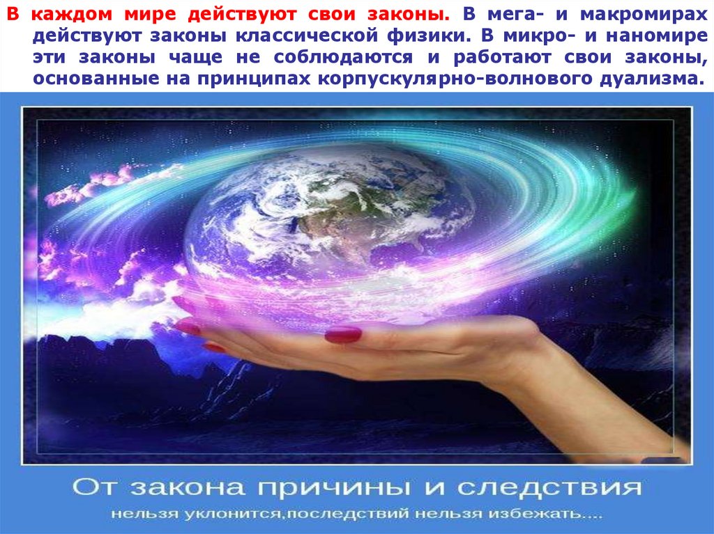 В каждом мире действуют свои законы. В мега- и макромирахдействуют законы классической физики. В микро- и наномире
