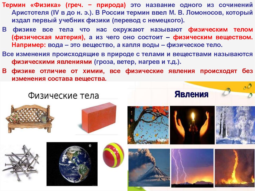 Термин «Физика» (греч. − природа) это название одного из сочиненийАристотеля (IV в до н. э.). В России термин ввел М. В. Ломоносов, который