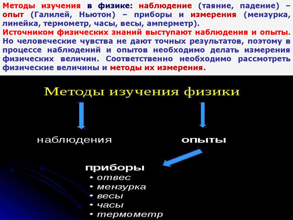 Методы изучения в физике: наблюдение (таяние, падение) –опыт (Галилей, Ньютон) – приборы и измерения (мензурка,