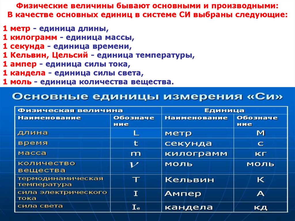 Физические величины бывают основными и производными:В качестве основных единиц в системе СИ выбраны следующие: