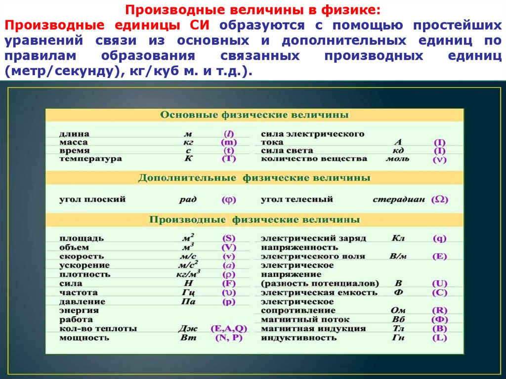 Производные величины в физике:Производные единицы СИ образуются с помощью простейших