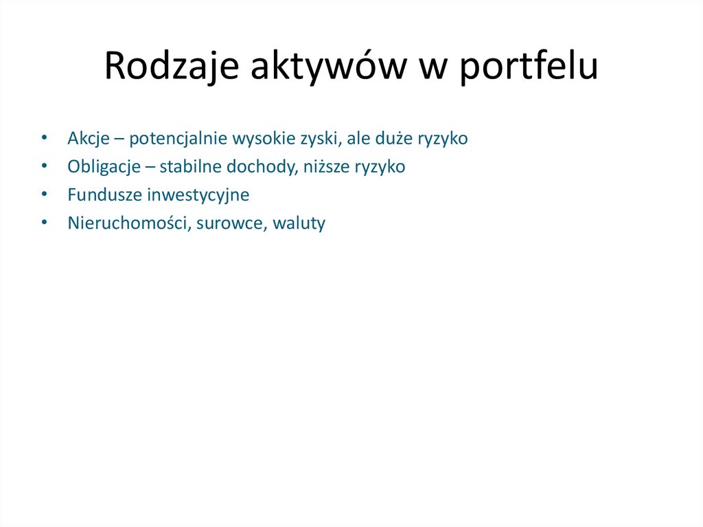 Rodzaje aktywów w portfeluAkcje – potencjalnie wysokie zyski, ale duże ryzyko