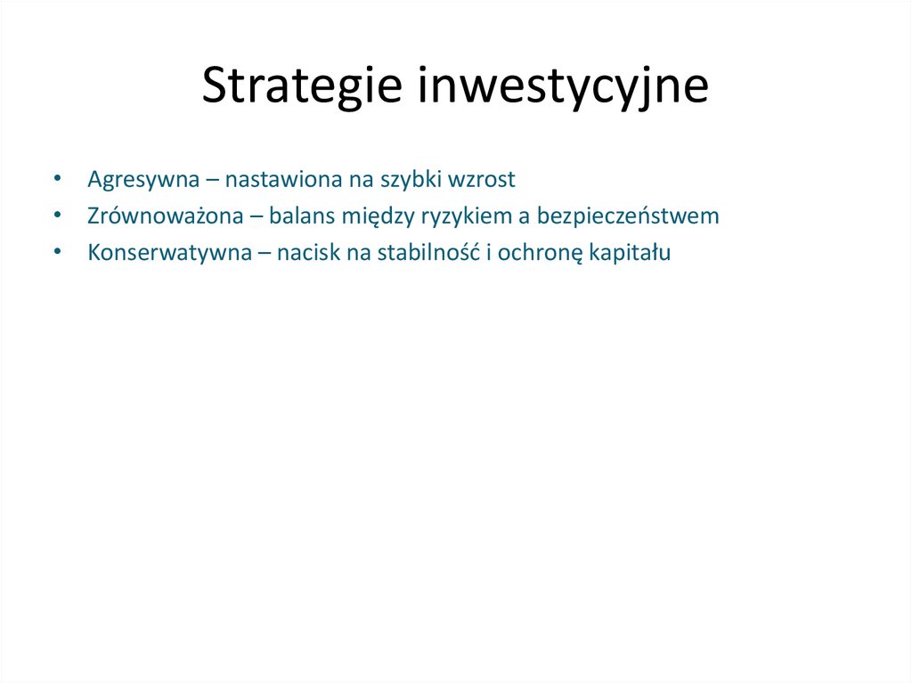 Strategie inwestycyjne• Agresywna – nastawiona na szybki wzrost