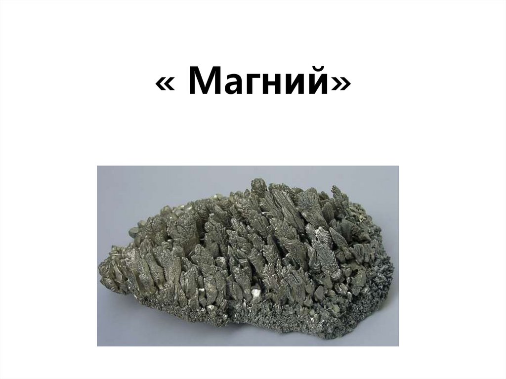 • Магний – это щелочной металл, серебристобелого цвета.• Относительно мягкий, пластичный, ковкий