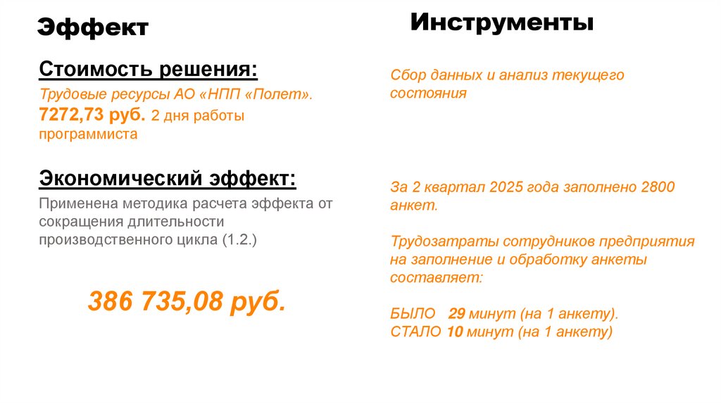 Сокращение трудозатрат до 10 минут (на 1 анкету) процесса 43,5%