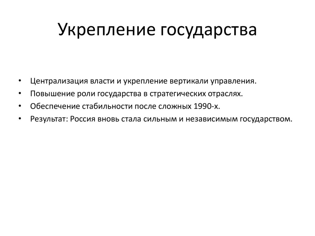 Укрепление государстваЦентрализация власти и укрепление вертикали управления.
