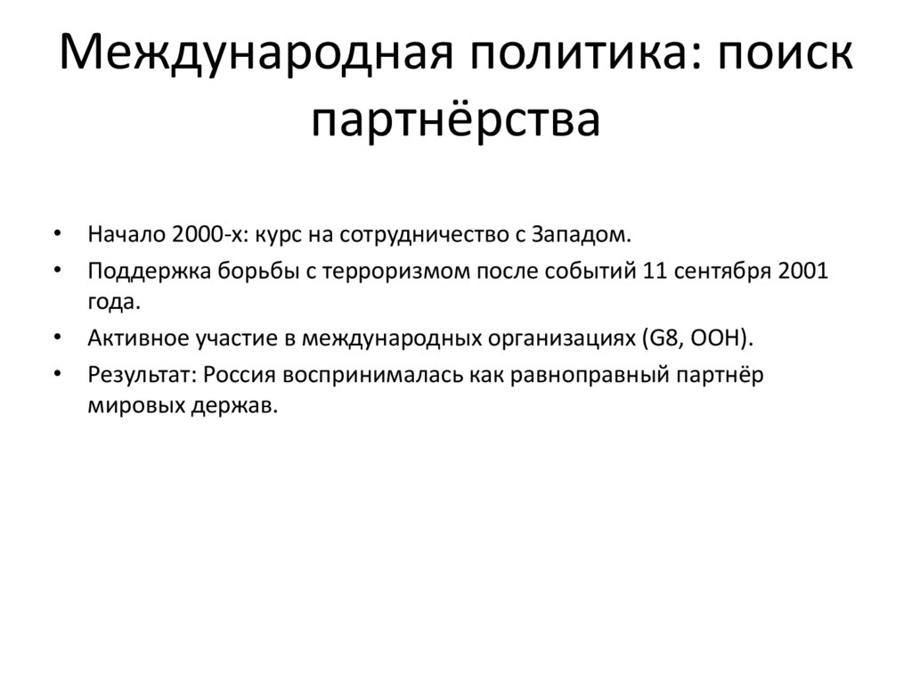 • Начало 2000-х: курс на сотрудничество с Западом.