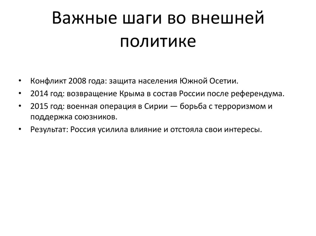 • Результат: Россия заявила о себе как о независимом и суверенном