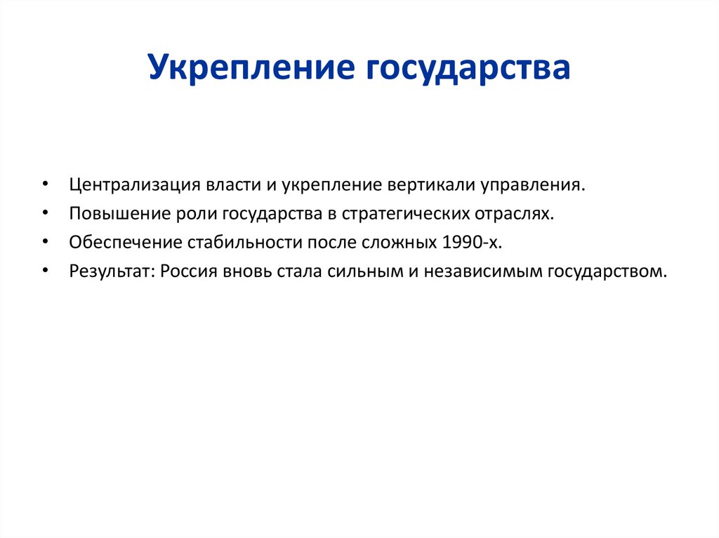 Укрепление государстваЦентрализация власти и укрепление вертикали управления.