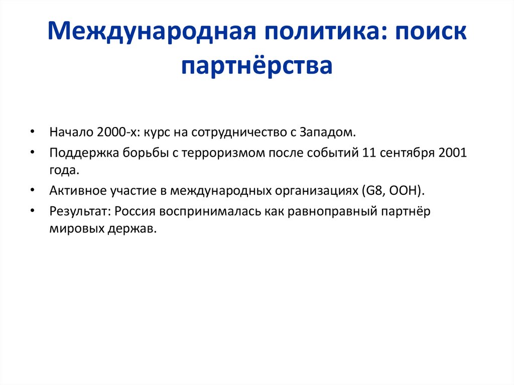 • Активное участие в международных организациях (G8, ООН).