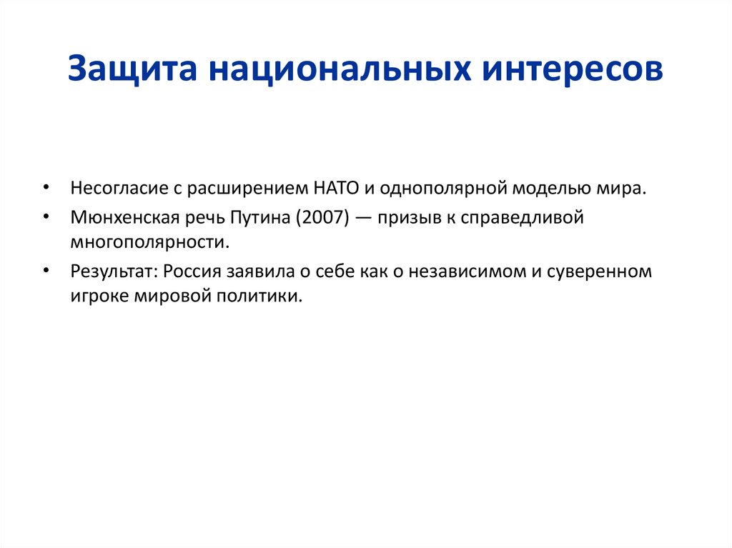 Защита национальных интересов• Несогласие с расширением НАТО и однополярной моделью мира.