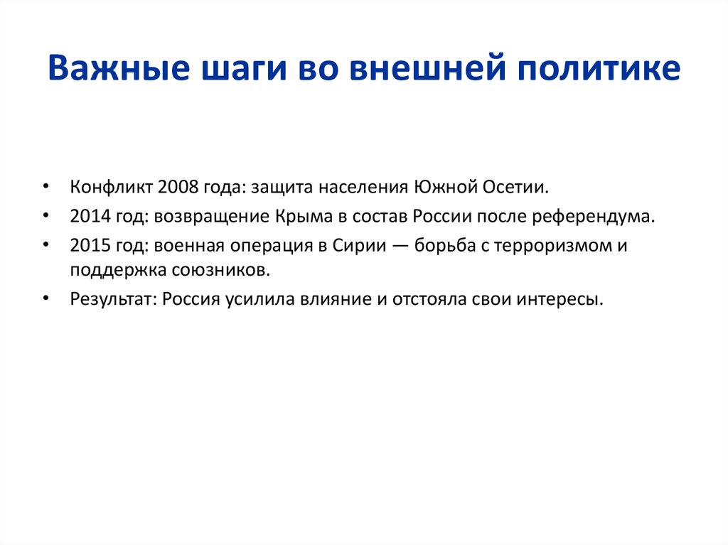• Результат: Россия усилила влияние и отстояла свои интересы.