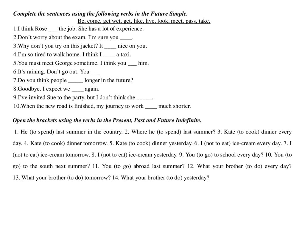 day. 4. Kate (to cook) dinner tomorrow. 5. Kate (to cook) dinner yesterday. 6. I (not to eat) ice-cream every day. 7. I