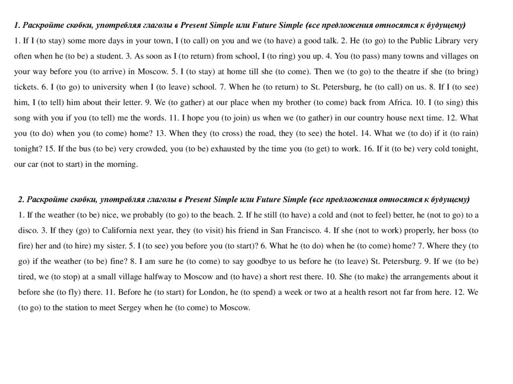 1. Раскройте скобки, употребляя глаголы в Present Simple или Future Simple (все предложения относятся к будущему)1. If I (to stay) some more days in your town, I (to call) on you and we (to have) a good talk. 2. He (to go) to the Public Library very
