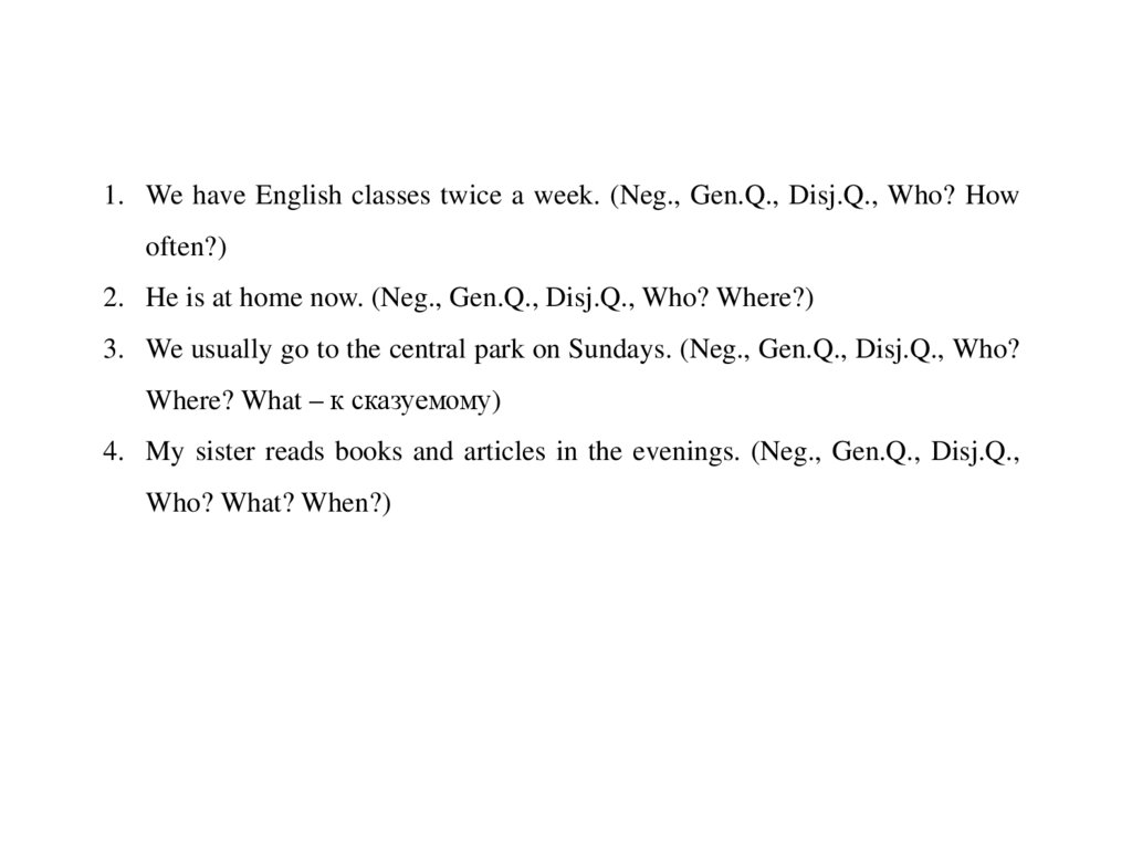 1. We have English classes twice a week. (Neg., Gen.Q., Disj.Q., Who? Howoften?)