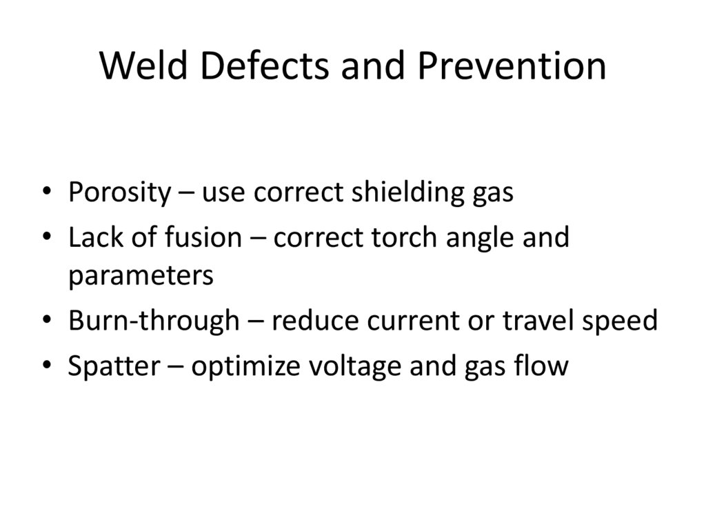 Weld Defects and Prevention• Porosity – use correct shielding gas