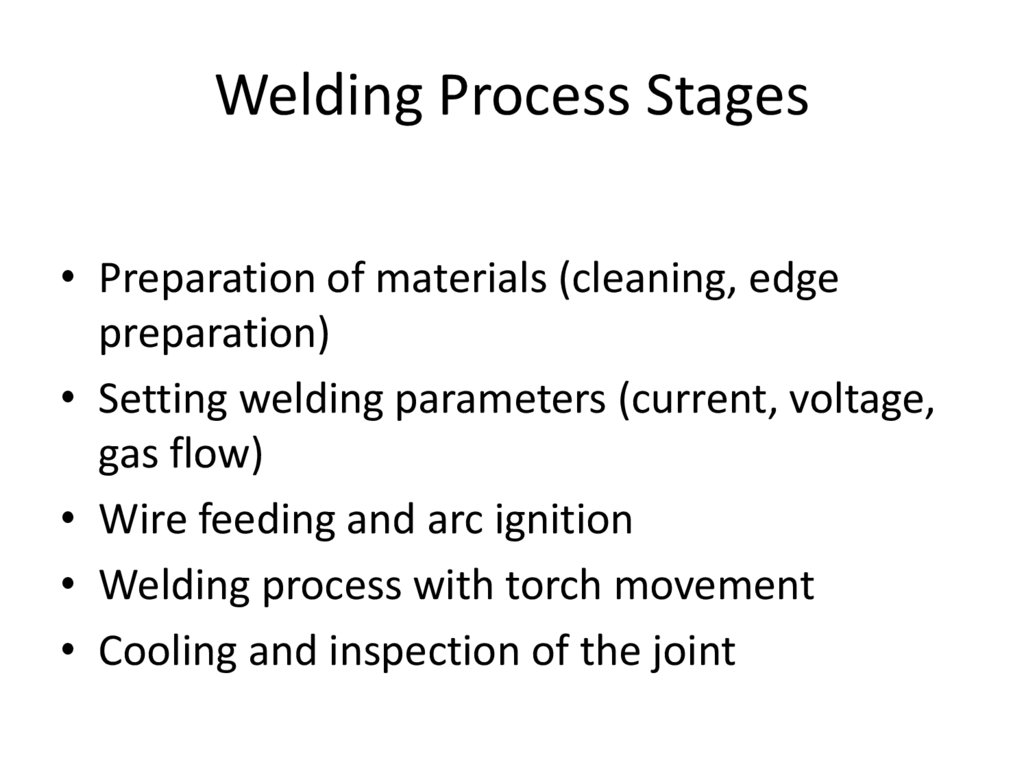 Welding Process Stages• Preparation of materials (cleaning, edge