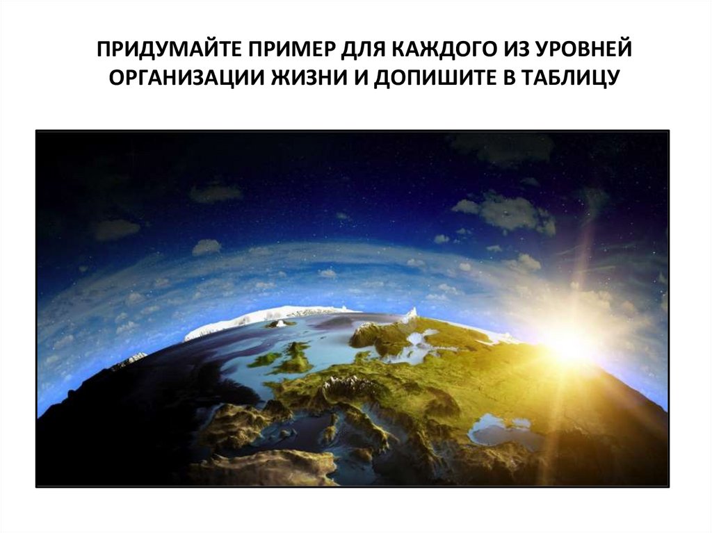 ПРИДУМАЙТЕ ПРИМЕР ДЛЯ КАЖДОГО ИЗ УРОВНЕЙОРГАНИЗАЦИИ ЖИЗНИ И ДОПИШИТЕ В ТАБЛИЦУ