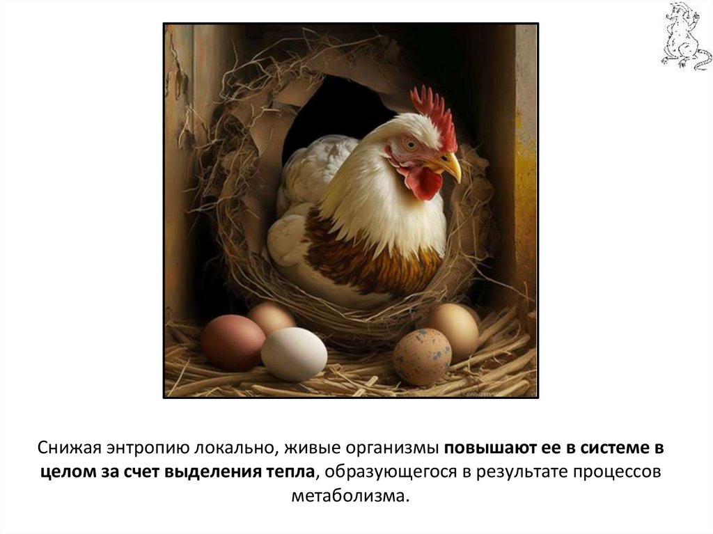 Снижая энтропию локально, живые организмы повышают ее в системе вцелом за счет выделения тепла, образующегося в результате процессов